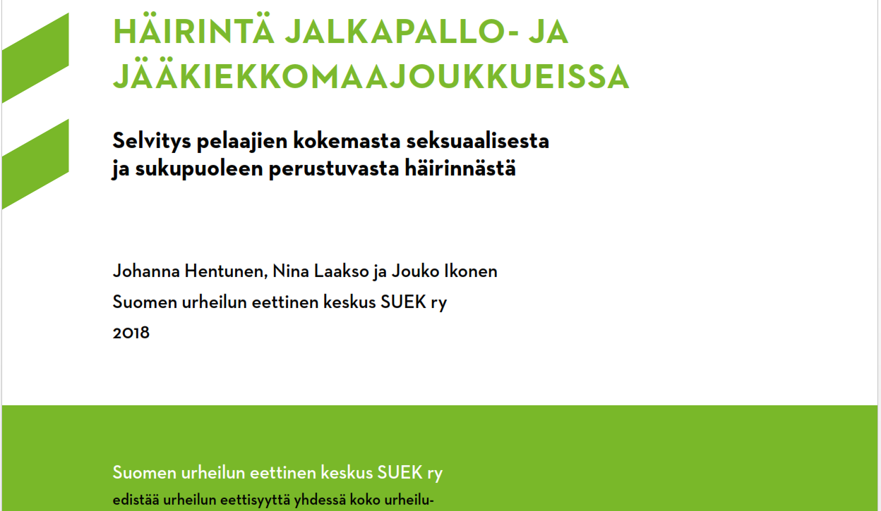 Suomen urheilun eettinen keskus SUEK ry:n tänään julkaiseman selvityksen mukaan kymmenet suomalaiset jalkapallo- ja jääkiekkomaajoukkueiden pelaajat ovat kokeneet häirintää pelaajauransa aikana. Häirintä kohdistuu erityisesti naisiin ja nuoriin. Vakavissa tapauksissa häirintään syyllistyi useimmiten urheilijaan auktoriteetti- tai luottamussuhteessa oleva henkilö. Selvitys toteutettiin liittojen yhteisestä aloitteesta.