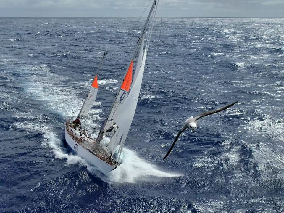 Galiana WithSecure saapui Uruguayn Punta del Esteen Ocean Globe Race -maailmanympäripurjehduksen kokonaiskilpailun kolmossijalla. Kilpailupäällikkö Don McIntyre kuitenkin vihjaisi venekunnan päätyvän osuuden tasoituskilpailussa kakkossijalle. Varakippari Ville Norran Etelämerellä ottamassa drone-kuvassa albatrossi luotsasi suomalaisvenettä kohti Kap Hornia. Kuva: Ville Norra, Galiana WithSecure